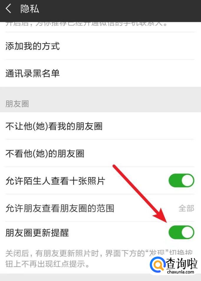 在隐私设置页面,点击‘朋友圈更新提醒’的开关就行了。
