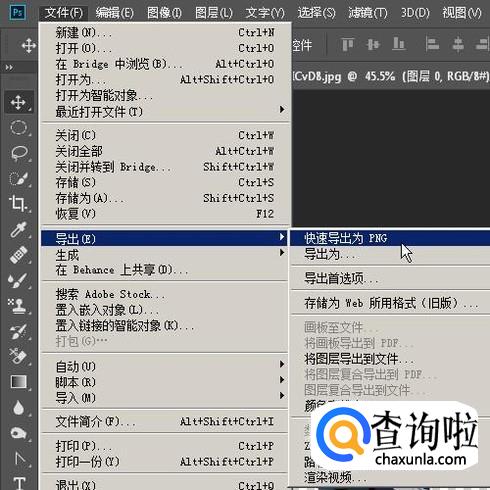 按下CTRL+D,取消选择状态;再点击:文件,再点:导出,再点:快速导出为PNG