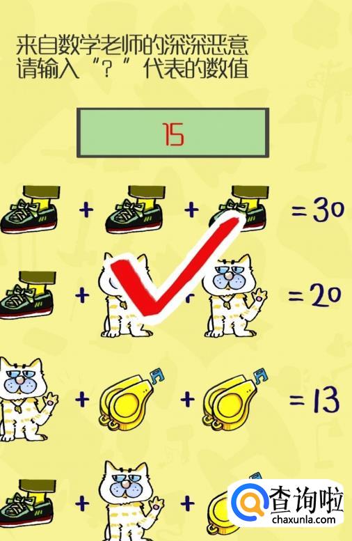 49关,答案是15,注意最后的运算猫上身没有铃铛,后面的铃铛也少了一个。