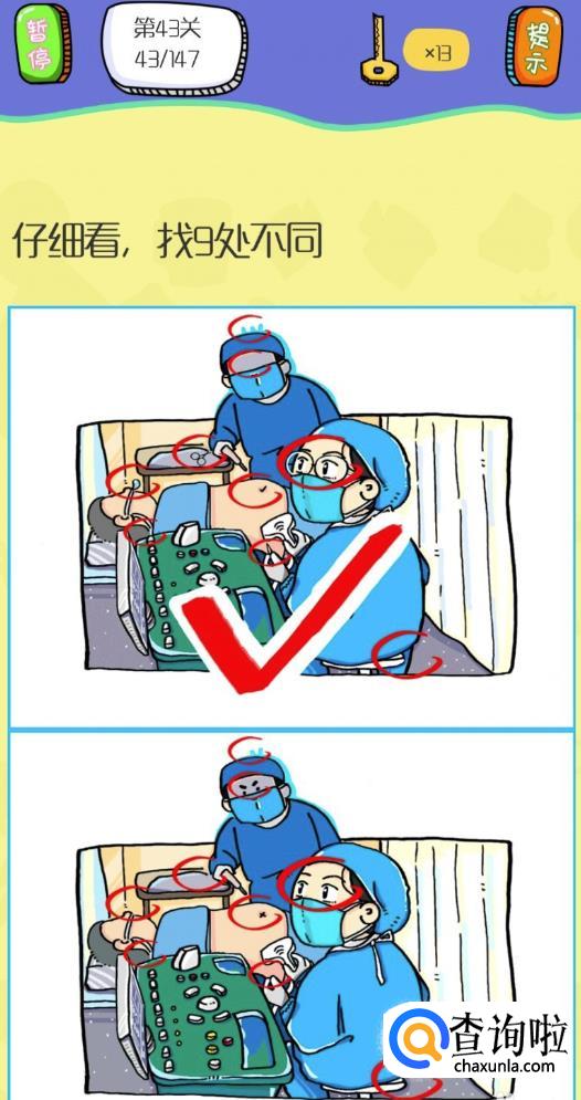 在43关的时候是一个查找不同的游戏,我们在下面的图中给你画好了位置。