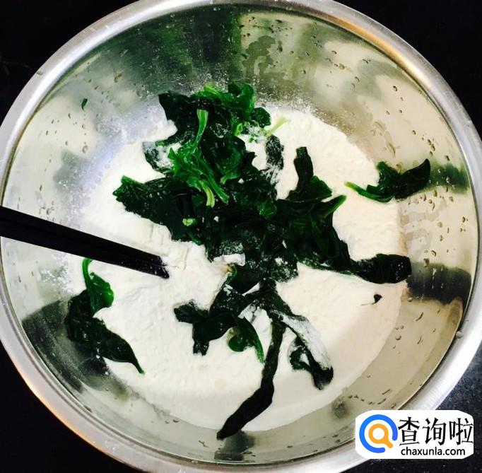 取适量的面粉放入容器中,把焯好水的菠菜取叶子也放入容器中