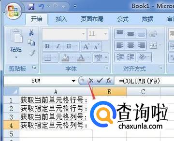 如果要获取指定单元格的列号,则输入=column(指定的单元格),如图获取f9的列号为6。