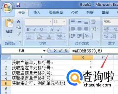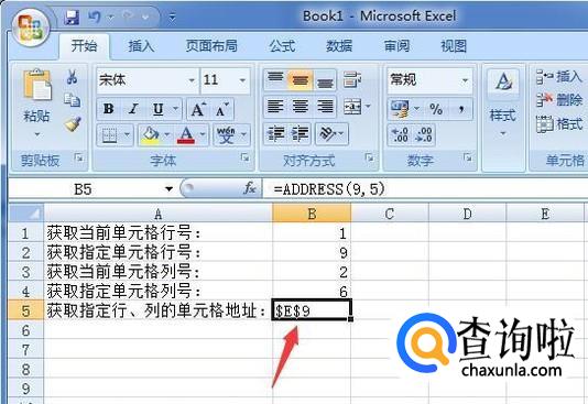 如果要获取指定行、列的单元格地址,则输入=ADDRESS(指定的行号,指定的列号),如图获取第9行,第5列的单元格地址为绝对地址E9
