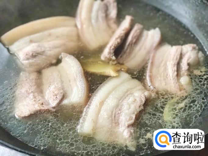 锅中倒如适量的清水,将姜切片,放入水中,五花肉切块,倒入水中,然后小火慢煮。