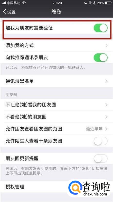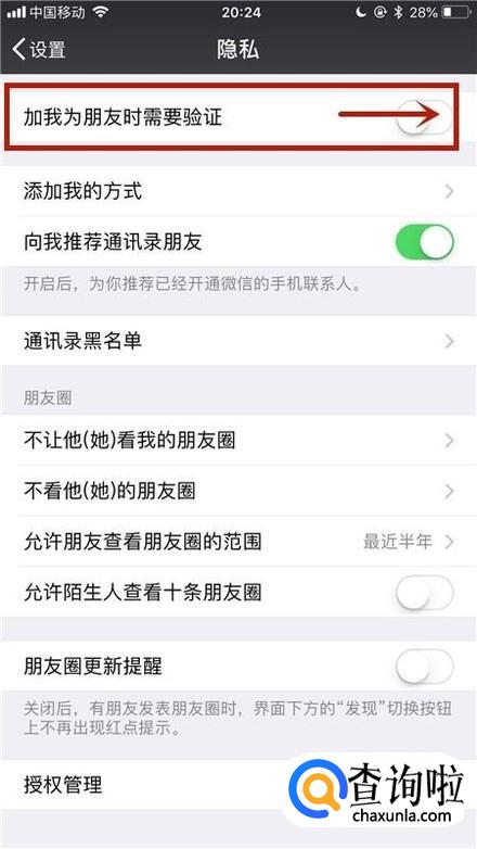 接着点击开启加我为朋友时需要验证开关,如下图所示。