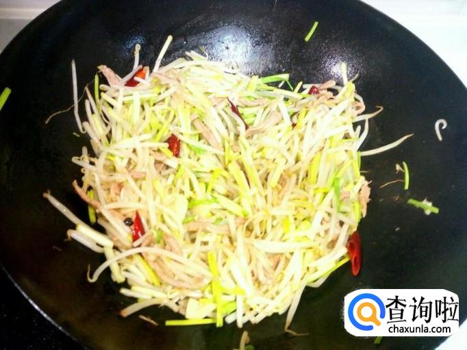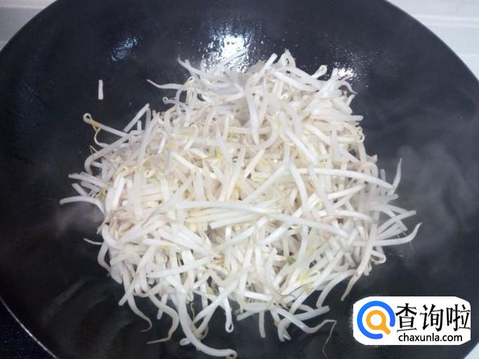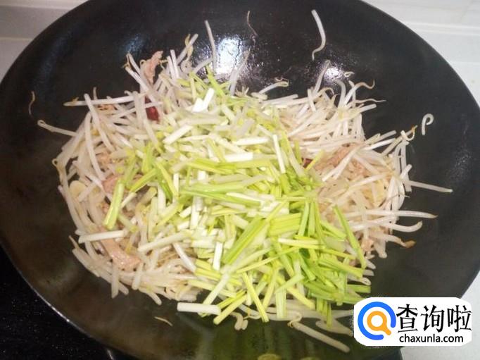 随即放入绿豆芽大火爆炒,滴少许醋。绿豆芽炒至变软,放入韭黄翻炒,放入盐。