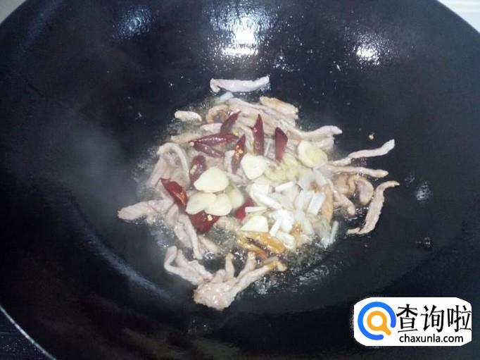 炒至肉丝颜色微白,放入料酒,蚝油,放入葱,姜,蒜,红干椒炒香。