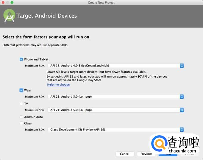 选择对应的android sdk版本,android像ios一样,也有很多分类版本了,从低到高,还有像android wear(手表), android TV(电视),android auto(车载)等各种版本,选择你要将这个项目跑到什么设备上边去,以及系统的版本,这里我们选择android手机项目,版本可以选择4.0,目前4.0基本就是最低版本,当然微信,qq,支付宝之类的都是一直支持到2.3版本的