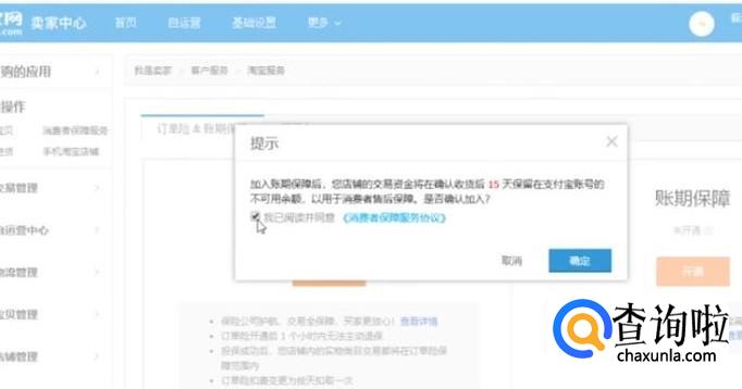 接下来会提示账期保障开通的提示,我们点击确定即可,如下图所示
