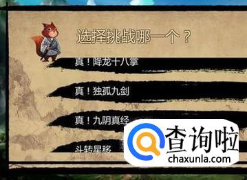 走出密林后你会发现一只松鼠,点击松鼠跟它对话,选择“赏它一颗松果”。之后对话框弹出“选择挑战哪一个”,下面是四本武功秘籍。