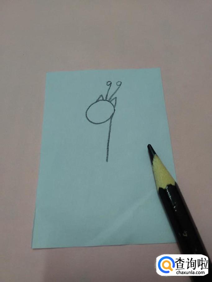 在头的中间画一个椭圆形,表示眼睛,在眼睛里画一个黑点,表示眼珠,在眼睛下面画一条弧线,分出嘴的部分,在弧线下面点一个黑点,表示鼻孔。