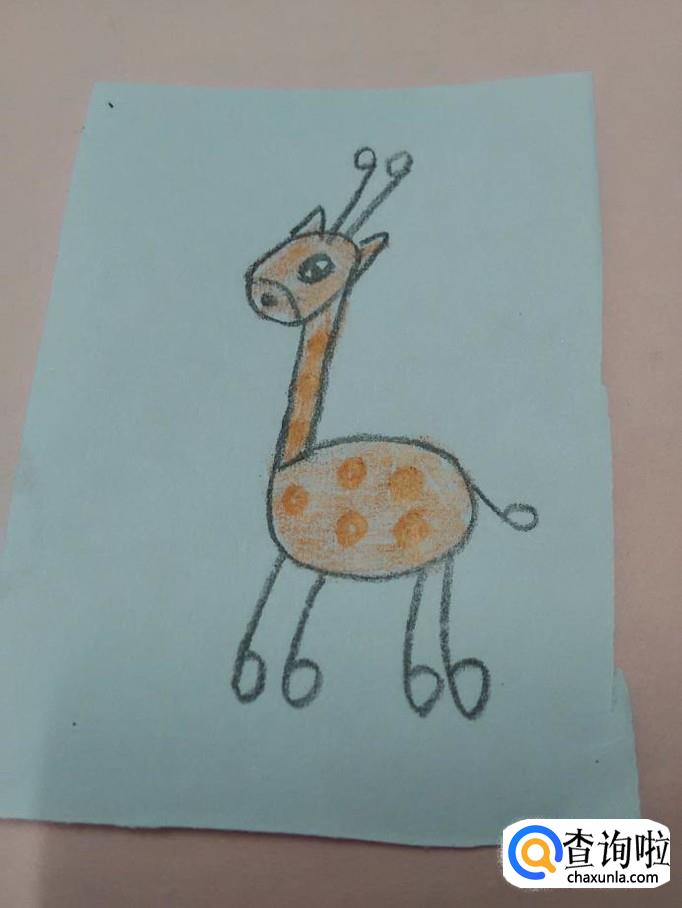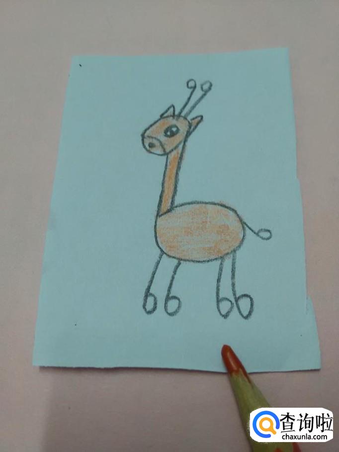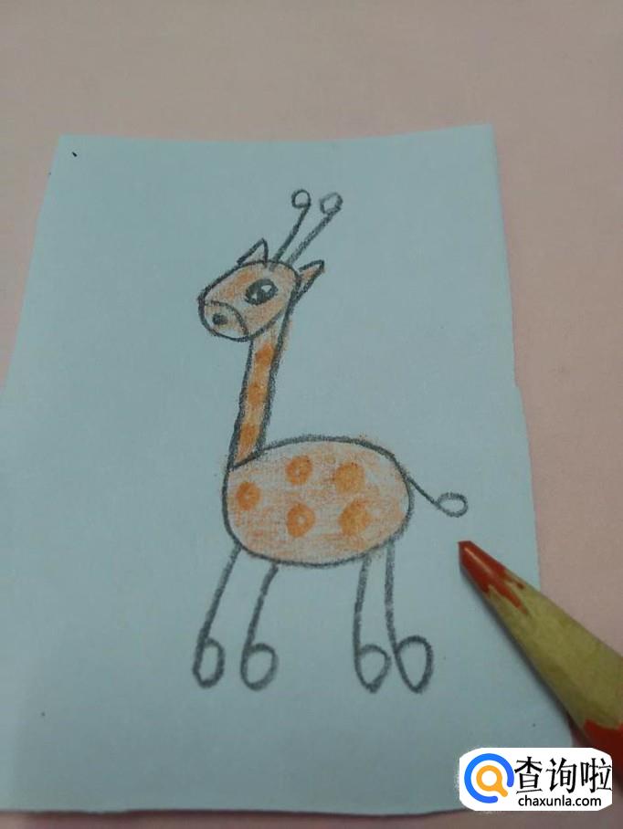 再用桔色在脖子和身体上重重地点几个桔色的圆点,表示斑点,长颈鹿就画完了。