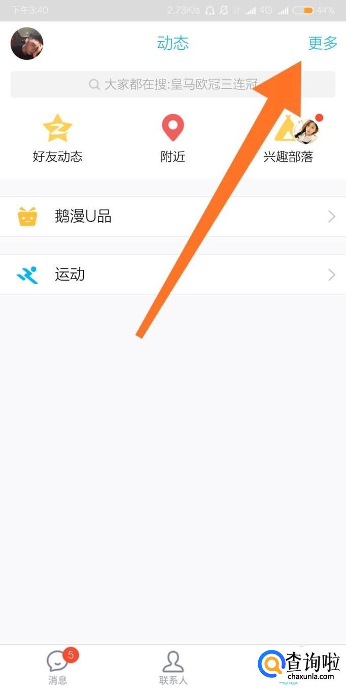 首先进入手机QQ动态页面,点击屏幕右上角的“更多”。