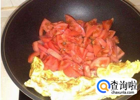 锅中加入适量植物油,油热后倒入蛋液,炒至鸡蛋凝固,然后倒入切好的西红柿,翻炒一下。
