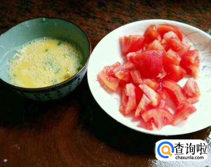 将鸡蛋打散放入碗中,加入适量食用盐和少量白糖,搅拌均匀。西红柿洗净切成块备用。