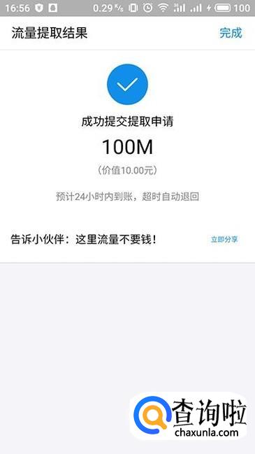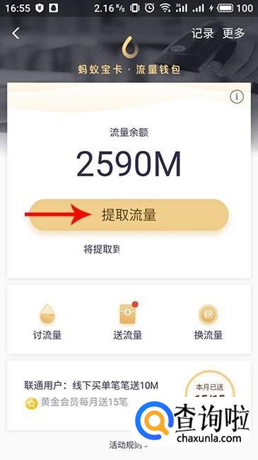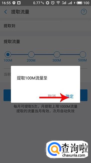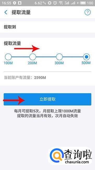 进入提取流量界面,选择需要提取的流量,单次最多提取500m,每月最多提取5次,并且上限为1000M。