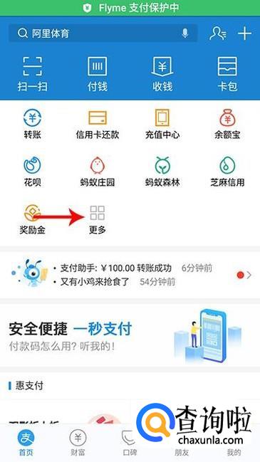 进入支付宝APP界面,在首页选项中点击“更多”进入。
