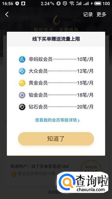 还有一个获取流量的方法,那就是通过线下买单了,会员等级不同获得的赠送上限笔数也不同,钻石会员单月最高20笔。