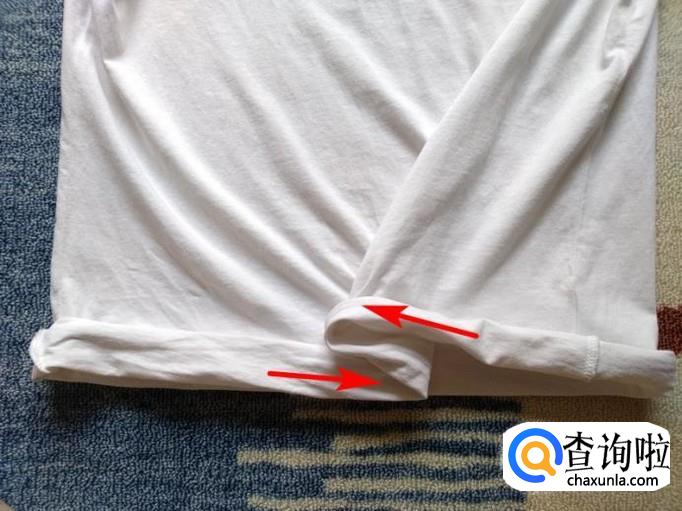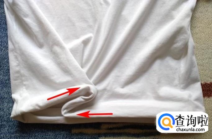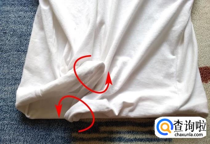 先将T恤里外翻一下,也就是里面翻出来,抓着T恤两个底边角向上卷4、5下,不要弄乱;