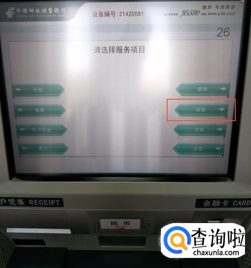 在服务项目中,可以办理多项业务,比如取款、存款、返回、改密等。如果是取款,就按“取款”键。