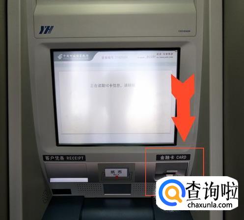 首先向ATM插入银行卡。银行卡插入“金融卡”处,机器会自动收卡进去。