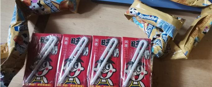 1、首先需要准备好一溜没有撕开的阿尔卑斯棒棒糖,和一排奶,可以说旺仔牛奶,也能是ad钙奶哦!