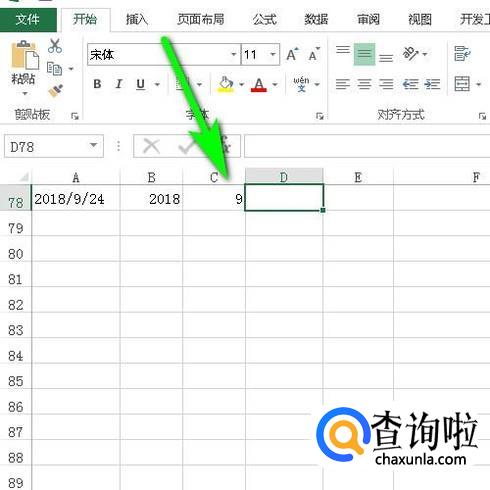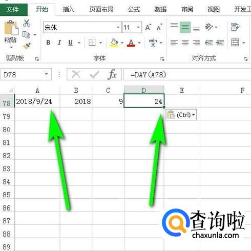 我们同样用A78单元格日期为例;在D78输入公式:=DAY(A78);按下回车键,得到日数:24