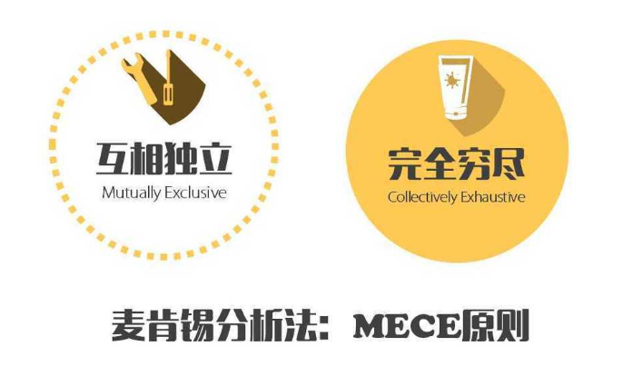 MECE分析法,全称Mutually Exclusive Collectively Exhaustive,中文意思是“相互独立,完全穷尽”。 也就是对于一个重大的议题,能够做到不重叠、不遗漏的分类,而且能够借此有效把握问题的核心,并解决问题的方法。