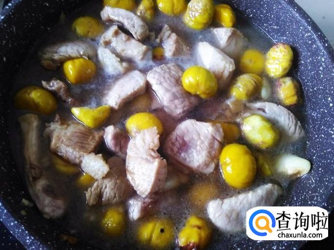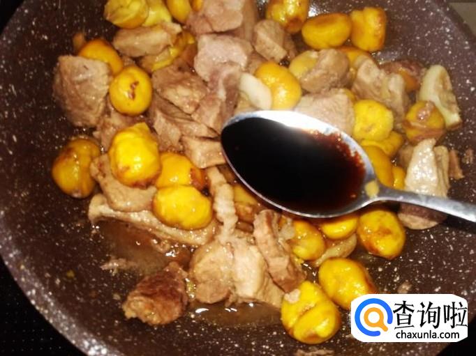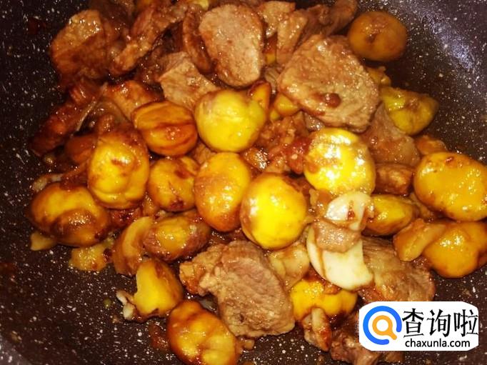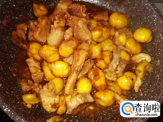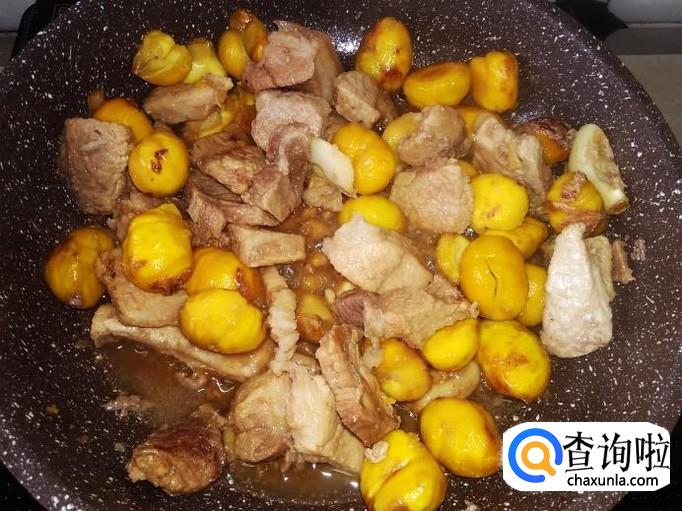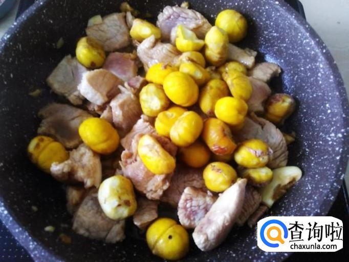 然后放板栗进去翻炒均匀,加1碗水进去。