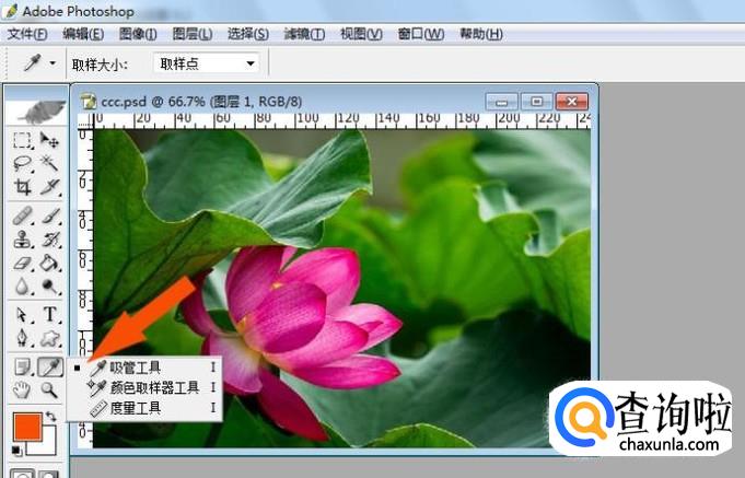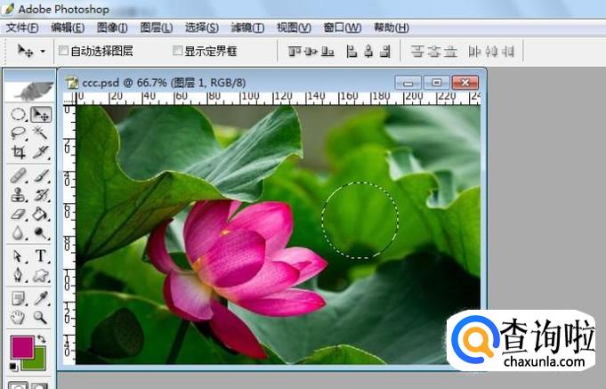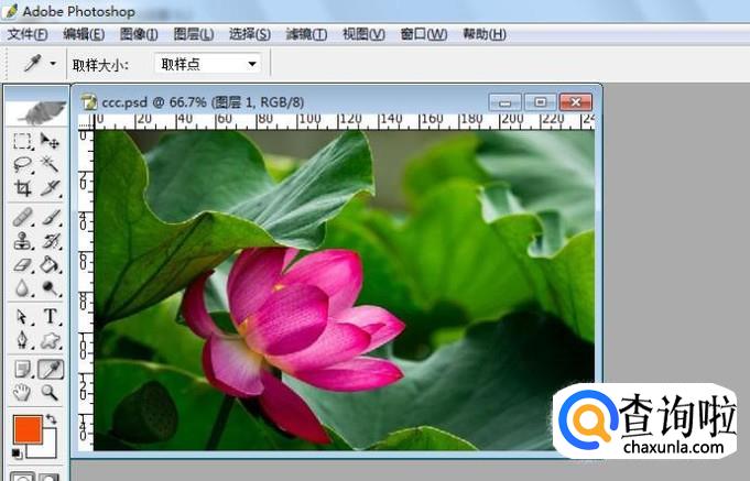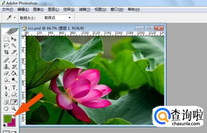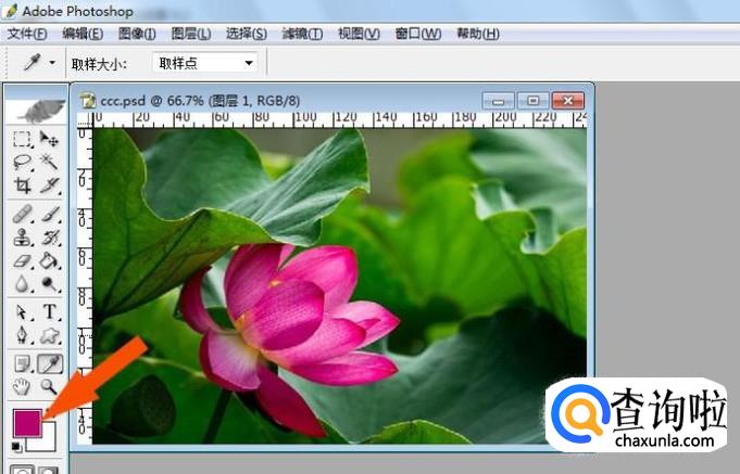 然后,把鼠标移动到图片上,在荷花图形的区域,单击选取颜色,可看到前景色改变为所选取的颜色,前景色为粉红色了,如下图所示。