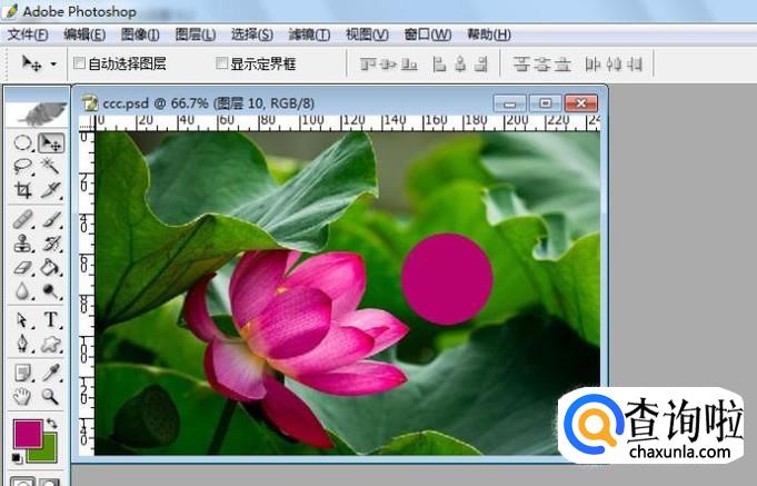 最后,可以给圆形区域进行填充,把前景色设置为粉红色,按键盘上的组合键【Alt+Delete】,这样圆形区域就填充为粉红颜色了,如下图所示。总结:通过运用吸管工具可以在图片上选取不同的颜色,来给选取区域填充前景色。