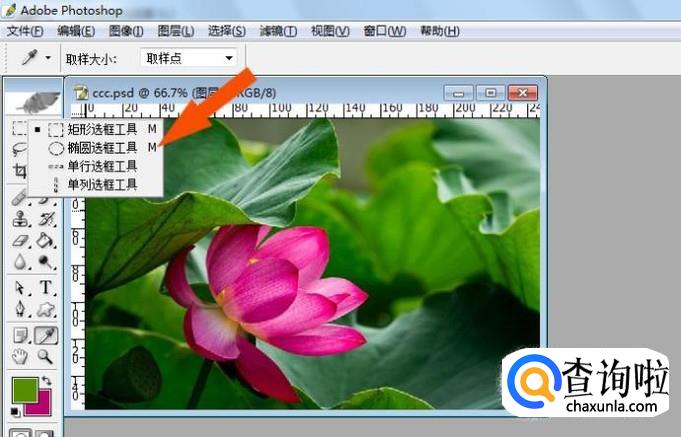 然后,鼠标左键在PS工具箱中选取【椭圆选框工具】,如下图所示。
