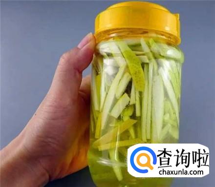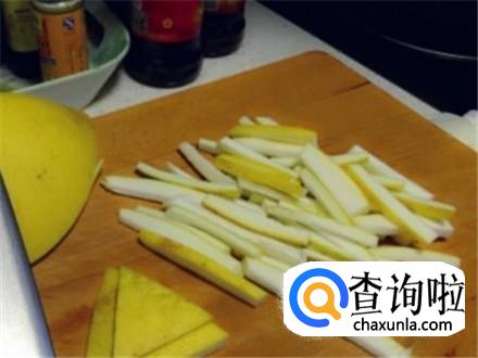用刀把柚子皮切成细细的丝,找个干净玻璃瓶放进去,加上清水刚刚没过柚子皮丝。