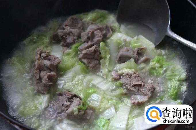 白菜洗好之后,去看一下炖的排骨,如果水沸了,就把浮在水上的泡泡打干净,然后加入些许的姜,盐,花椒面,鸡精,草果面,尝一下味道是否合适,最后改为小火慢炖。