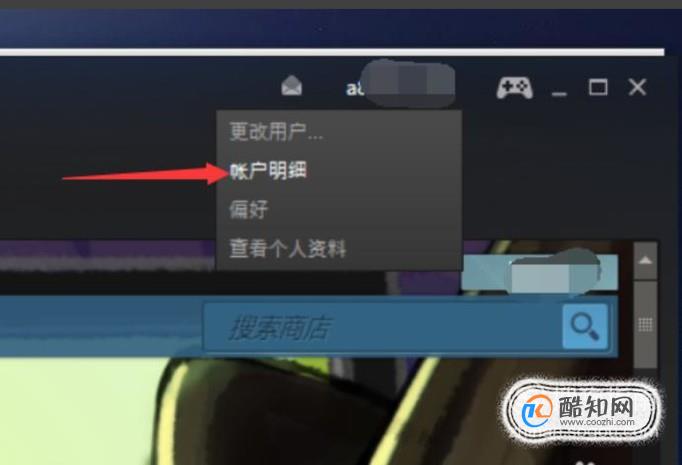 登陆steam,点击右上方客户端的“账户名”,在弹出的框中选择“账户明细”。