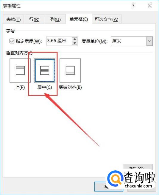 在表格属性设置页面中,我们点击选择“单元格”选项卡,然后设置垂直方向上为“居中”显示,并点击“确定”按钮。