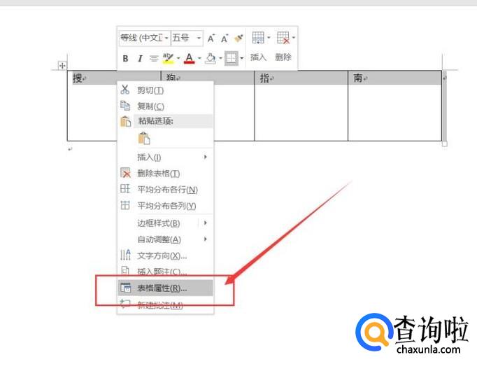 在Word文件中的表格文字,我们选中该段文字之后,对该文件击右键,选择“表格属性”选项。