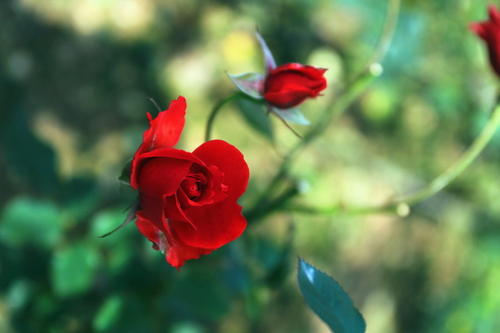 21、玫瑰大都有一根细长而坚固的主茎,上面长满了坚硬的刺,不小心扎在手上还真有些疼呢。玫瑰茎上长着一片片深绿色的叶子。风儿轻轻一吹,叶子随风飘舞起来,活像一位位身穿绿衣的美丽仙子在跳舞。茎的顶端还长着许多含苞欲放的花骨朵儿!
