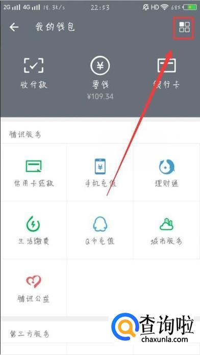 进入钱包页面,点击图示位置功能键,进入微信支付中心,如图所示。