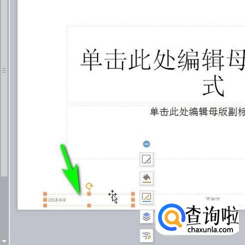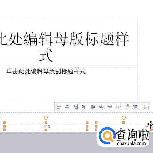 进入到编辑母版的视图。在内容区的底部这里,左中右各有三个文本框,鼠标分别选中这三个文本框,再按DELETE键删除。