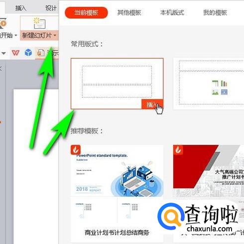 新建WPS演示文稿,进入到操作界面中。鼠标点击新建幻灯片按钮,弹出的面板中点击插入幻灯片。