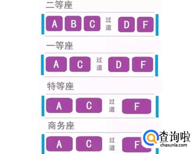 二等座座席号:A、F靠窗,C、D靠过道,B在三人座中间。