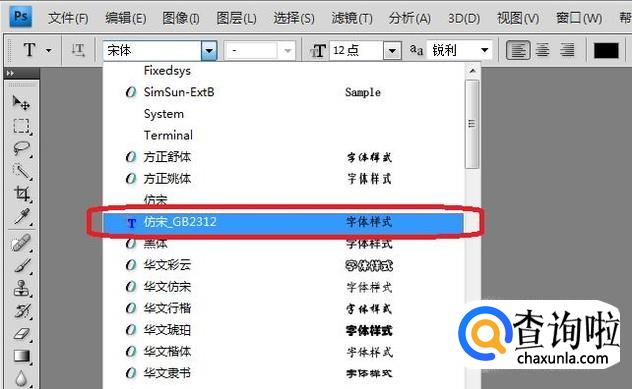 这样,系统中就有长仿宋字体了,我们打开软件就能用该字体输入。比如说,我打开PS软件,点击字体样式下拉菜单,就能找到仿宋_GB2312。