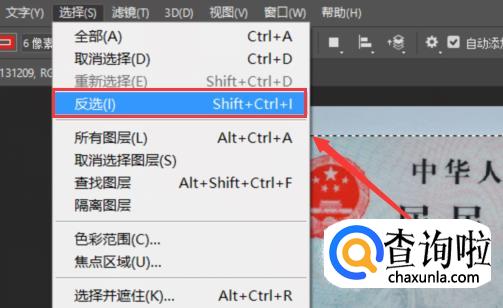 在上方工具栏中点击“选择”,然后选择“反选”。