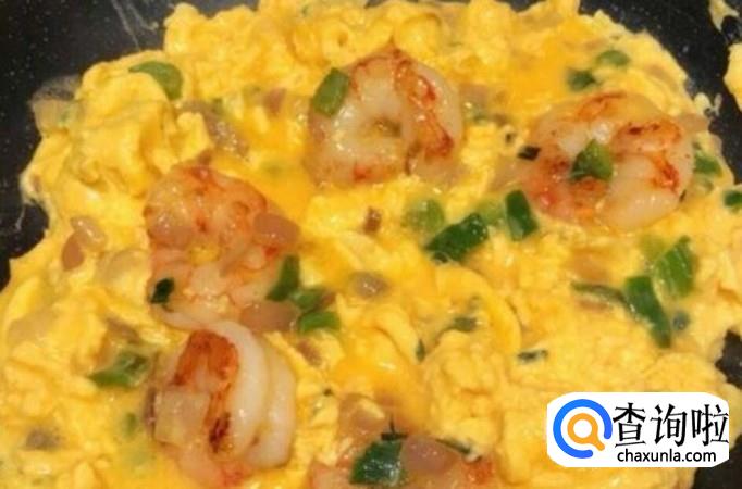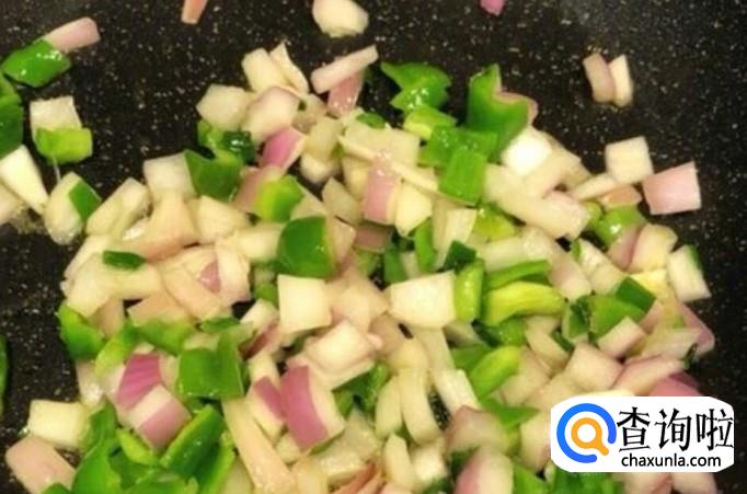首先打4个鸡蛋搅匀,然后将洋葱和青椒切成丁,热锅倒油,将其炒一会儿,然后加入虾仁翻炒,直到虾仁炒熟。