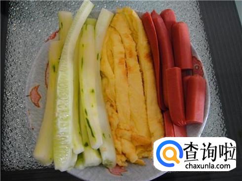 做寿司准备的食材没有什么固定的,有人喜欢用肉松、蛋皮、黄瓜、火腿肠,有些人喜欢用一些肉丝生菜之类,这个随你自己的喜好决定。一般黄瓜胡萝卜和火腿一定是需要的,切成长条就行。