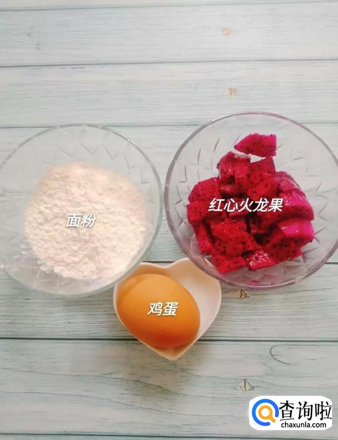 首先准备好要用到的面粉、鸡蛋和红心火龙果,如下图所示。