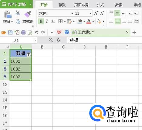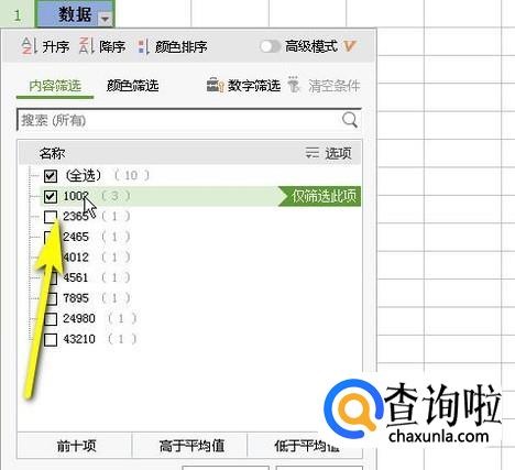 点击此按钮,弹出筛选面板, 每个数据后面都有括号,而括号内的数值表示该数据一共出现几次。那么,如图所示,勾选1002的,再点确定。