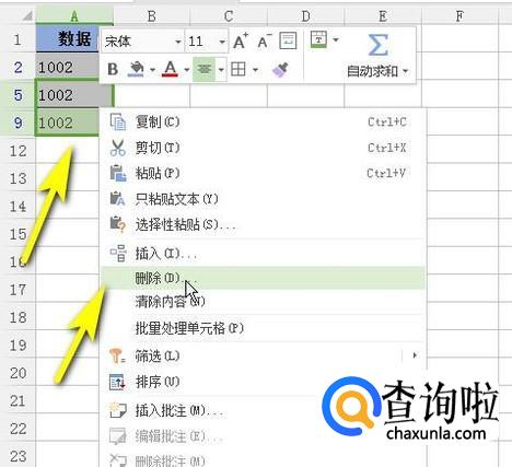 如图所示,选择下面两个重复数据。并且右击,弹出菜单点击:删除