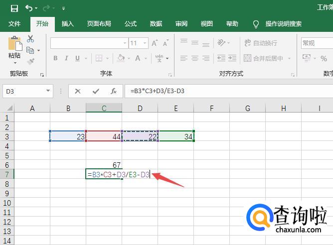 在图示中的单元格中输入=B3*C3+D3/E3-D3,然后按回车键,这是个相对来说复杂一点的公式;